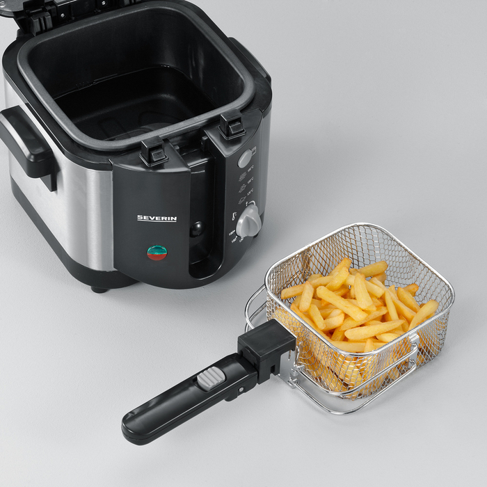 Die Severin kommt in puncto Ausstattung „ohne Schnickschnsack“ aus, wie immer wieder gern Modelle wohlwohlend beschrieben werden, die eher spartanisch ausgestattet sind. Die Bedienung der Friteuse kommt mit einem einfachen Temperaturregler aus und das Gehäuse soll speziell isoliert sein, damit sich beim Frittieren niemand die Finger verbrennt. Der Fettbehälter ist antihaftbeschichtet und in den Deckel ist ein Sichtfenster eingelassen, das jederzeit einen freien Blick auf den Frittierkorb zulassen soll – was jedoch stark bezweifelt werden darf, denn in den meisten Fällen in dieser Leistungsklasse beschlägt das Sichtfenster stark, da Kondenswasser und Dampf nicht abtransportiert werden. Das Frittieren mit der Severin erfordert demnach das richtige blinde Timing. Fehlanzeige dagegen sind eine Liftfunktion, damit der Frittierkorb bei geschlossenem Deckel ins heiße Fett versenkt werden kann, und der in den Deckel eingelassene Wechselfilter nennt sich im Datenblatt vorsorglich „Fettfilter“ und nicht „Geruchsfilter“ – was von ihm also erwartet werden darf, muss offen bleiben, bis die ersten Kundenrezensionen zu dem Gerät auftauchen.