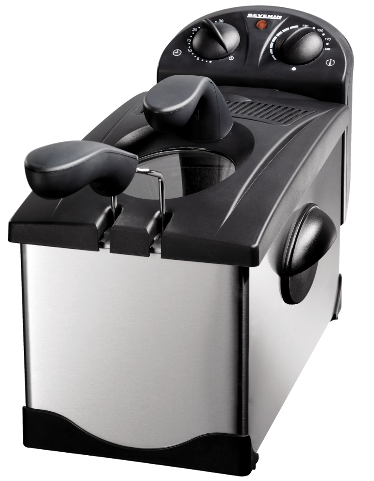 Die Severin hat eine Leistungsaufnahme 2100 Watt, mit der maximal 3 Liter Fett erhitzt werden. Insgesamt können 600Gramm Speisen zubereitet werden. Die Temperatur kann durch einen Drehregler gewählt werden. Leider verfügt das gerät über keinen automatisch öffnenden Deckel, so dass beim Öffnen der Fritteuse Vorsicht geboten ist, da Fett oder heißes Kondenswasser spritzen könnten. Zur Überprüfung des Bräunungsgrads des Frittierguts verfügt die Fritteuse über ein Sichtfenster. Praktisch ist auch der Timer, durch den die Frittierzeit festgelegt werden kann. In dieser Preisklasse sind nicht allzu viele damit ausgestattet. Ein klarer Pluspunkt für die Severin.