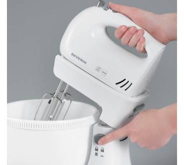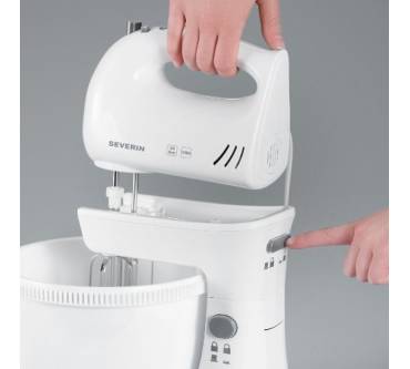 Positiv hervorzuheben an dem Modell von Severin ist dafür aber auf jeden Fall das einfache Handling, das durch den Kippmechanismus der Standhalterung ermöglicht wird. Zum bequemen Einsetzen/Entfernen der Rühr-/Knethaken lässt sich der Handrührer nämlich nach hinten kippen. Außerdem nimmt das Set mit Abmessungen von rund 33 x 23 x 23 Zentimeter vergleichsweise wenig Platz weg.