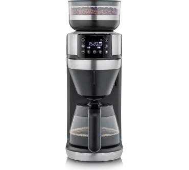 Die Filterkaffeemaschine mit Mahlwerk und Glaskanne ermöglicht nachhaltigen Kaffeegenuss mit einem wieder verwendbaren Goldton-Kaffeefilter. Dies spart Ressourcen und Sie müssen keine Papierfilter mehr kaufen. Bei Bedarf können Sie aber auch jederzeit herkömmliche Papierfilter einsetzen. Mit einer Kaffeemenge von 100 bis 350 Milliliter eignet sich das Modell ideal für Ein- bis Zweipersonenhaushalte und kleine Küchen. Die Bedienung ist Anwendern zufolge komfortabel und einfach dank eines übersichtlichen LED-Touch-Displays. Ein Highlight ist die individuell anpassbare Tassenabstellfläche. Hier können Sie neben der im Lieferumfang enthaltenen Glaskanne auch weitere Behältnisse wie Tassen, Becher, ToGo-Becher oder Thermokanne verwenden. Das integrierte Kaffeebohnen-Mahlwerk arbeitet vergleichsweise leise, wie Nutzer berichten. Es zieht dank „Cup Control“ Funktion automatisch nur so viel Wasser wie nötig. Die Kaffeemenge und –stärke können Sie nach Belieben einstellen. Durch die integrierte Vorbrühfunktion und die optimale Brühtemperatur von bis zu 96 Grad Celsius gelingt der frisch gemahlene Kaffee heiß und aromatisch, was Rezensenten bestätigen. Dank abnehmbarer Teile ist die Maschine einfach sauber zu halten.