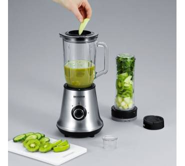 Wer nun allerdings einen Hochleistungsmixer erwartet, liegt falsch. Der Severin wird nämlich, was sein Leistungspotenzial betrifft, einen ganz normalen Durchschnittsmixer abgeben, mit dem sich die gängigen Anforderungen wie etwa Frucht- und Milchshakes, pürierte Suppen und Saucen sowie das Zerkleinern von Obst, Gemüse, Fleisch und Co erledigen lassen. Maximal 500 Watt sorgen für genügend Power, denn Mixer benötigen nur selten, selbst bei schwierigen Aufgaben, mehr. Außerdem soll sich der Mixer sogar zum Zerkleinern von Eiswürfeln einigen. Die Auswahl an Geschwindigkeitsstufen beschränkt sich auf zwei und eine Pulsstufe. Sonderlich feinfühlig kann das Mixen und Zerkleinern daher nicht auf die Konsistenz des jeweiligen Lebensmittels abgestimmt werden, weswegen die Arbeit des Severin entsprechend überwacht werden sollte, damit auch das gewünschte Ergebnis erzielt wird. Der Mixbehälter selbst besteht erfreulicherweise aus Glas, nimmt also weder Farbe und Geruch der verarbeiteten Lebensmittel an. Über seine Größe ist noch nichts Näheres bekannt, das Fassungsvermögen wird aber wahrscheinlich bei 1,2 Litern liegen.