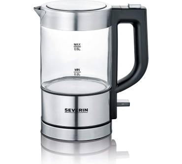 Dieser kleine Wasserkocher von Severin ist eine gute Option, wenn Sie Single sind oder öfter wenig heißes Wasser benötigen. Die 0,5 Liter sind in rund 3 Minuten siedefertig, danach schaltet das Gerät automatisch ab. Sie können aus allen Richtungen auf den Behälter zugreifen, die Basisstation dreht sich um 360 Grad. Praktisch ist auch die beidseitig angebrachte Mess-Skala, die Ihnen sowohl als Rechts- als auch Linkshänder einen guten Blick auf den Wasserstand verschafft. Ein waschbarer Kalkfilter ist ebenfalls integriert. Laut Hersteller sind die Plastikteile aus 100 Prozent BPA-freiem Kunststoff. Rezensenten bemängeln aber einen störenden Geruch zu Beginn der Nutzung. Durch die schmale Form ist der Behälter außerdem etwas schwer zugängig, was Ihnen die Reinigung erschwert.