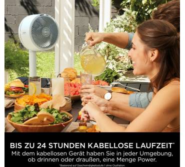 Dank des integrierten wiederaufladbaren Akkus muss für den Betrieb keine Steckdose in der Nähe sein. Somit ist eine erfrischende Brise auch im Garten oder auf der Terrasse unkompliziert möglich. Laut Hersteller reicht die Kapazität des Akkus für 24 Stunden Laufzeit aus. Dieser Wert gilt allerdings nur für die Nutzung auf der kleinsten Leistungsstufe. Fünf Stufen gibt es insgesamt. Der Ventilator soll eine Reichweite von bis zu 20 Metern haben. Bei so einer hohen Entfernung ist die mitgelieferte Fernbedienung nützlich.