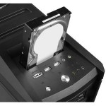 In das Bandit ATX-Midi-Tower-Gehäuse hat Sharkoon eine der auch separat vom Hersteller vertriebenen Dockingstationen für externe Festplatten integriert. Der Slot für eine SATA-Festplatte des Formfaktors 2,5 und 3,5 sitzt an der Oberseite des Towers und ist damit sehr leicht zugänglich. Sharkoon reagiert mit dem außergewöhnlichen Feature auf die in der letzten Zeit verzeichnete rege Nachfrage an externen Dockingstationen. Wer regelmäßig mit unterschiedlichen Platten arbeitet, wird sich über den Zusatzkomfort sicherlich freuen.