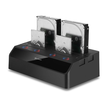 Datenjunkies, die nicht genug Festplatten an ihren PC oder auch an das Notebook anschließen können, offeriert Sharkoon ab sofort das passende Gerät dafür. In der SATA QuickPort Quattro können bis zu vier Festplatten oder SSDs gleichzeitig untergebracht und über schnelle Schnittstellen mit dem Rechner verbunden werden. Wie immer entfällt dabei der umwegige Einbau der Platten in das PC-Gehäuse, dafür sollte auf dem Schreibtisch ein bisschen Platz für die Dockingstation vorhanden sein.