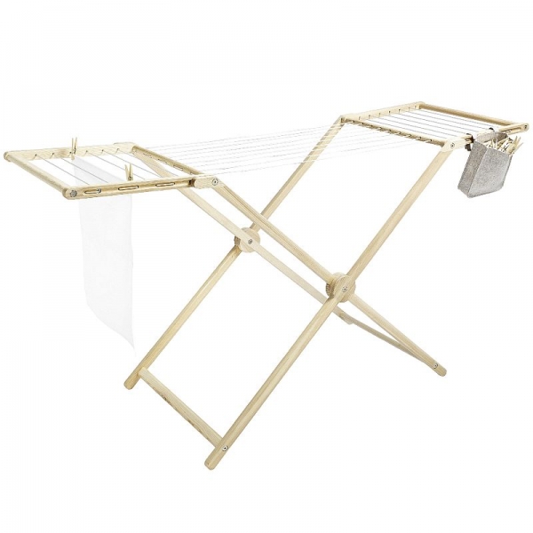 Produziert wird der Wäscheständer in den Caritas Werkstätten Wendelstein, in denen rund 120 behinderte Menschen beschäftigt sind. In der hauseigenen Schreinerei werden die Produkte zu einem großen Anteil in traditioneller Handarbeit hergestellt, verwendet werden dabei ausschließlich heimische Hölzer. Im Falle des Wäscheständers handelt es sich dabei um massive Esche, ein Werkstoff, der für seine Robustheit und Stabilität bekannt ist. Die Oberfläche des Holzes wird nicht behandelt. Es empfiehlt sich also, den Wäscheständer vor der ersten Benutzung zu ölen, wachsen oder zu lackieren, wobei, dem ökologischen Grundgedanken des Produkts folgend, umweltschonende Mittel verwendet werden sollten. Für das Design wiederum zeichnet die Grafikagentur fpm factor product münchen verantwortlich, es wurde 2001 mit dem Design-Award FORM ausgezeichnet. Die Wäsche hängt auf Kunststoffleinen, die verstärkt wurden. Ihre Gesamtlänge ist leider nicht bekannt, dafür die Abmessung des Wäscheständers. Er ist 185 Zentimeter lang, 63 Zentimeter breit sowie 86 Zentimeter hoch – mit anderen Worten: Er entspricht in der Größe in etwa den meisten gängigen Wäscheständern aus Metall und Kunststoff.