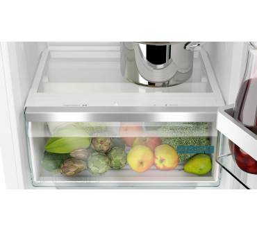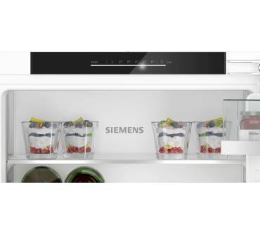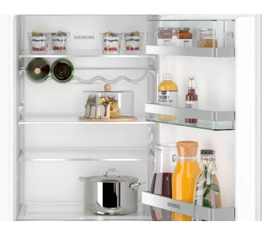 Der Einbaukühlschrank von Siemens ist zur Integration in ein vorhandenes Küchendesign vorgesehen, er wird mithilfe von Flachscharnieren montiert. Drei der vier Einlegeböden aus Sicherheitsglas lassen sich in der Höhe verstellen. Eine Flaschenablage ermöglicht Ihnen das sichere Unterbringen Ihrer Getränke. Das Gemüsefach ist mit einer Feuchtigkeitsregulierung für optimale Lagerungsbedingungen ausgestattet. Für die gleichmäßige Verteilung der Kälte sorgt die Umluftkühlung. Überblick über Ihre gekühlten Vorräte verschafft Ihnen ein LED-Licht. Das Touch-Panel zur Bedienung ist bei geschlossener Tür nicht sichtbar. Das Einbaugerät ist in die Energieeffizienzklasse D eingruppiert, in Sachen Nachhaltigkeit bleibt also noch einige Luft nach oben. Mit einem Lärmwert von nur 27 Dezibel ist der Siemens außergewöhnlich leise.