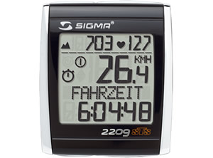 Der BC 2209 MHR ist das neue Topmodell der Fahrradcomputer-Serie von Sigma Sport. Er bietet Informationen und Daten für aktive Radsportler, die eine möglichst umfangreiche Auswertung ihrer Trainingskilometer wünschen. Deswegen sind in den BC 2209 MHR neben den Grundfunktionen zur Geschwindigkeit- und Zeitmessung auch Funktionen zur Aufzeichnung der Tritt- und Herzfrequenz sowie ein Höhenmesser integriert. Das Flaggschiff schlägt trotzdem nur mit – gemessen an der Ausstattung – moderaten 125 Euro zu Buche.
