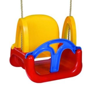 Auf den ersten Blick ist die 3 in 1 Schaukel der renommierten Simba Dickie Group ein durchdachtes Konzept, das jede Wachstumsphase der Kinder berücksichtigen soll: Der der rote Schaukelsitz verfügt über einen vorne mittig angebrachten Sicherheitsbügel sowie eine gelbe Rückenlehne. Beide Teile sind abnehmbar – und sollen der Entwicklung Kindes entsprechend wachsende Bewegungsfreiheit und weiteren Aktionsradius vermitteln. Der Schaukelsitz verfügt über die Maße 42 x 17 Zentimeter und soll nach Auskunft des Herstellers ein Gewicht von maximal 60 Kilogramm tragen. Durch den Sitz führt links und rechts je ein Seil, dessen Länge bis 120 Zentimeter verstellbar ist, aufgehängt wird er an Aufhängeringen. Auf Stufe eins, im geschlossenen Sitz mit Rückenlehne plus Sicherheitsbügel also, sollen Kinder bis drei Jahren schaukeln. In der zweiten Stufe sollen Kinder von drei bis fünf bereits ohne Haltegriff schaukeln und in der letzten Altersstufe ab fünf ist auch die Rückenlehne obsolet.
