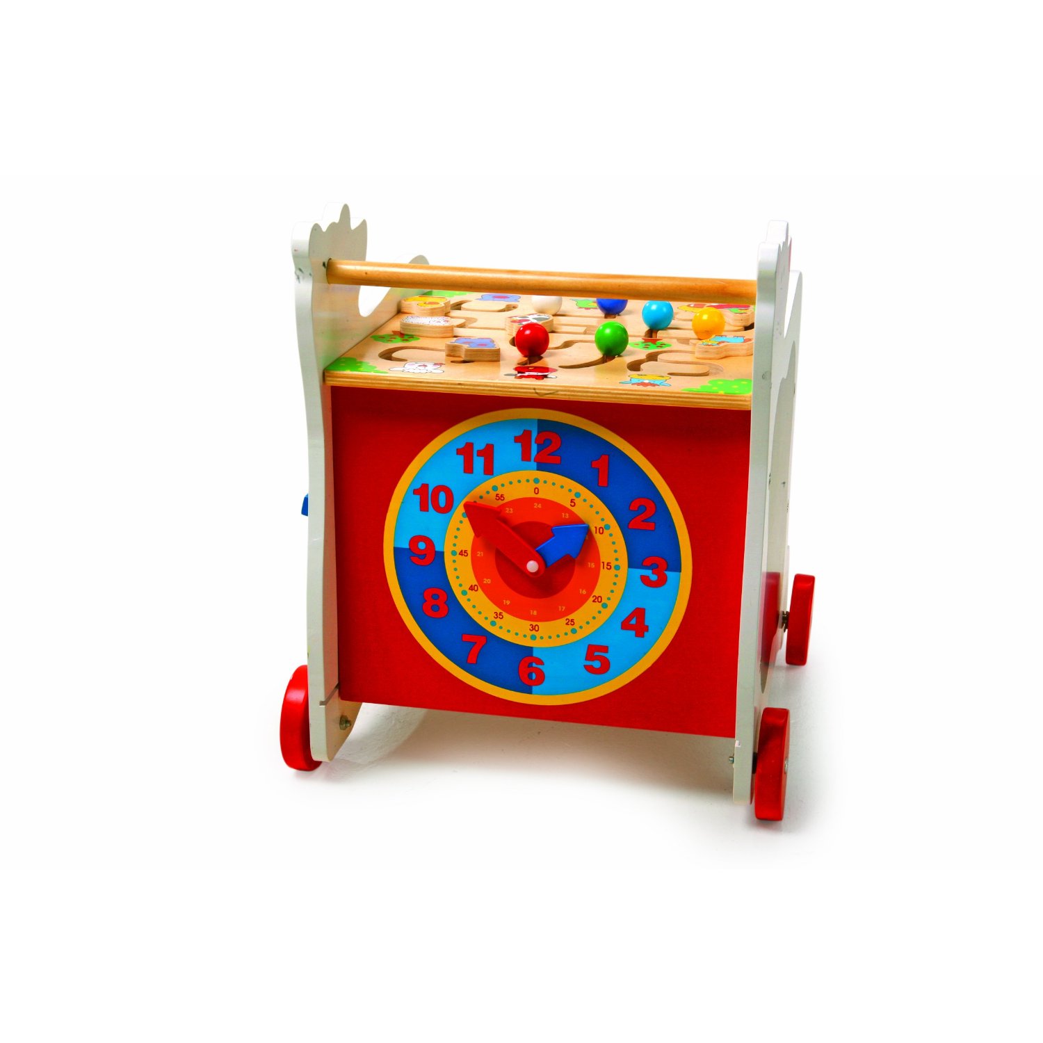 Es sind vor allem die zusätzlichen Features, die einen Lauflernwagen über die Lauflernphase hinaus zum langjährigen Begleiter machen. Der Bär hat neben seiner eigentlichen Lauflernfunktion noch eine Reihe von Spiel- und Lernmöglichkeiten zu bieten: Zum Beispiel die große Spieluhr, Motorikspiele, Drehelemente mit Tieren und Zahlen, eine Maltafel oder ein Steckspiel. Konkret besteht der Lauflernwagen aus einem Holzgestell mit Deckel auf vier Holzrädern, ist also Lauflernwagen, Aufbewahrungsbox und Spielcenter in einem. Ein Greifstange wiederum dient Kindern zum Hochziehen und unterstützt sie als Balancegeber bei ihren ersten Schritten.