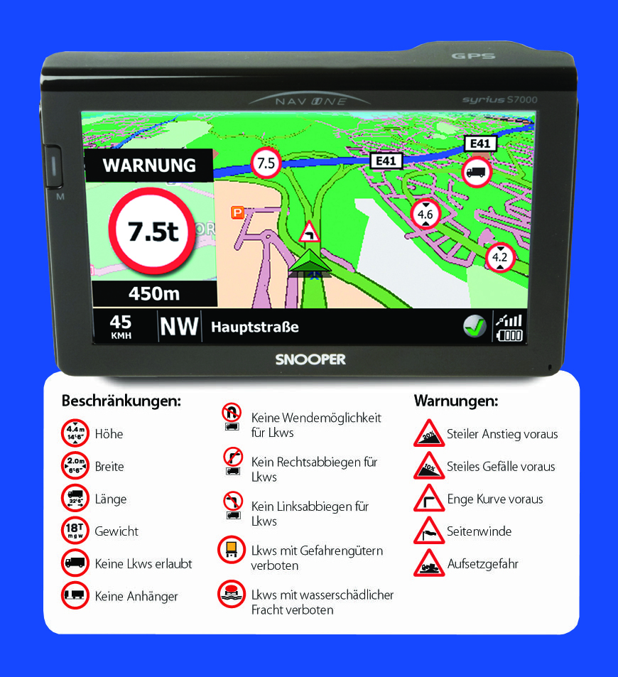 Die spezielle LKW-Navigationssoftware des Snooper S7000 Truckmate berücksichtigt natürlich nicht nur, wie oben angedeutet, die Straßenverhältnisse bei der Routenberechnung und schließt zum Beispiel zu kleine Tunnels, niedrige Brücken oder Dorfdurchfahrten aus beziehungsweise kennt die LKW-spezifischen Geschwindigkeitsberechnungen. Sie speichert auch fahrzeugspezifische Profile von bis zu 10 Fahrzeugen ab, also etwa Länge, Gewicht und Beladung (Anhänger und Gefahrguttransporte zum Beispiel). Diese Parameter fließen ebenfalls in die Routenberechnung und das Routing ein. Außerdem hilft das Navi noch, Sprit zu sparen. Eine ökonomische Route vermeidet zum Beispiel steile Anstiege, wenn als Alternative auch eine flache Strecke zur Verfügung steht.
