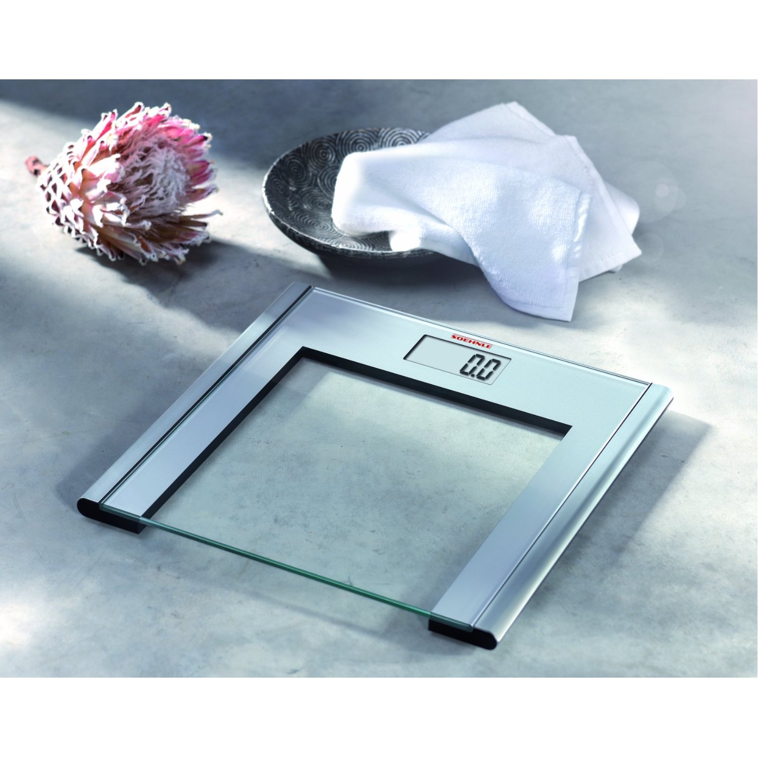 Einigkeit herrscht allerdings darüber, dass es sich bei der Personenwaage von Soehnle um ein ausgesprochenes Schmuckstück handelt. Gefertigt wird sie hauptsächlich aus Sicherheitsglas, das daher auch den optischen Eindruck dominiert, der entsprechend leicht und „luftig“ ausfällt – die durchsichtige Wiegefläche lässt fast ganz vergessen, dass auf dem Badezimmerboden eine Waage steht. Eingefasst wird die Trittfläche von einem Rahmen aus Aluminium, in den ein großes Display eingelassen ist – auch die Ablesbarkeit der Anzeige entzieht sich jeglicher Kritik. Die Waage ist etwas mehr als zwei Zentimeter hoch, die Trittfläche selbst fällt mit rund 32 x 30 Zentimetern großzügig aus und vermittelt daher auch eine hohe Trittsicherheit – gut zu wissen für alle, die nicht mehr so sicher auf den Beinen sind. Das maximale Körpergewicht für die Soehnle liegt bei 150 Kilogramm, die Waage nimmt außerdem ihre Arbeit sofort auf, sobald sie betreten wird, und schaltet sich auch automatisch ab. Die Stromversorgung erfolgt über normale Batterien.