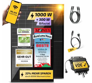 Das Balkonkraftwerk von Solakon beinhaltet zwei Module, die es zusammen auf eine Nennleistung von 1.000 Watt bringen. Es handelt sich um bifaziale Module, deren Rückseite ebenfalls Strom erzeugen kann. Auf diese Weise sollen zusätzlich 300 Watt Nennleistung zur Verfügung stehen. Die verbauten Solarzellen sind vom N-Typ und erzeugen auch bei geringer Sonneneinstrahlung elektrische Energie. Ebenfalls Teil des Sets ist ein Wechselrichter, dessen Ausgangsleistung auf gesetzeskonforme 800 Watt begrenzt ist. Überwachen können Sie Ihr Kleinkraftwerk bequem über das Smartphone. Mit im Lieferumfang dabei sind die benötigten Gleich- und Wechselstromkabel. Das passende Montagematerial müssen Sie allerdings separat gegen Aufpreis erwerben.