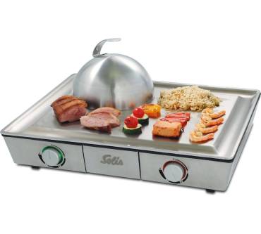 Auf dem Solis wird portionsweise gegrillt – also keine großen Steaks am Stück, aber auch keine dicken Würste. Spieße, kleine Medaillons, Schnitzelchen, Fisch und natürlich jede Art von Gemüse sind die eigentliche Domäne des Grills. Dabei kann auf zwei Zonen gegrillt werden, jede mit einem eigenen Thermostat regelbar – praktisch. Auslaufende Flüssigkeiten oder Marinaden laufen im besten Fall Richtung Ablaufrinne. In der Regel muss allerdings mit einem Spatel nachgeholfen werden, wie Kunden berichten. Unter der mitgelieferten Glocke kann gedünstet und geschmort werden. Die Fläche selbst reicht für zwei bis maximal vier Personen aus.