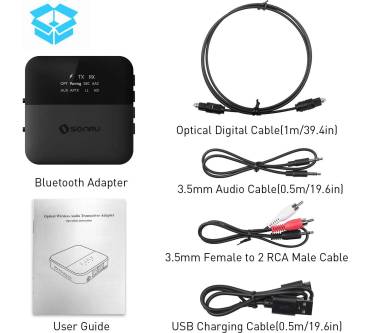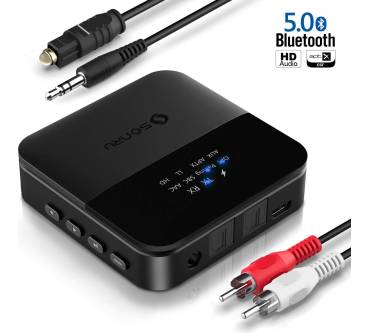 Die kleine Box von Sonru erweitert Ihr HiFi-System um einen Bluetooth-Empfänger – praktisch, wenn Sie Musik vom Smartphone drahtlos zur Anlage spielen wollen. Doch damit nicht genug, denn der BT1002 fungiert nicht nur als Empfänger, sondern auch als Sender, wobei sich zwei Kopfhörer gleichzeitig ansteuern lassen. Rückseitig stehen ein analoger Aux- sowie zwei digital optische Buchsen bereit, passende Kabel für die Verbindung zum Fernseher oder anderen Geräten sind im Paket inbegriffen. Den Klang beschreibt der Tester von „Audio Video Foto Bild“ als detailarm und etwas leise – trotzdem reicht es mit 2,8 zu einem „Befriedigend“. Von Kundenseite gibt es hier bessere Bewertungen. „Völlig problemlos“ zeigt sich der Transmitter im Betrieb, auch wenn die Tasten nach Meinung des Testers etwas klein geraten sind.