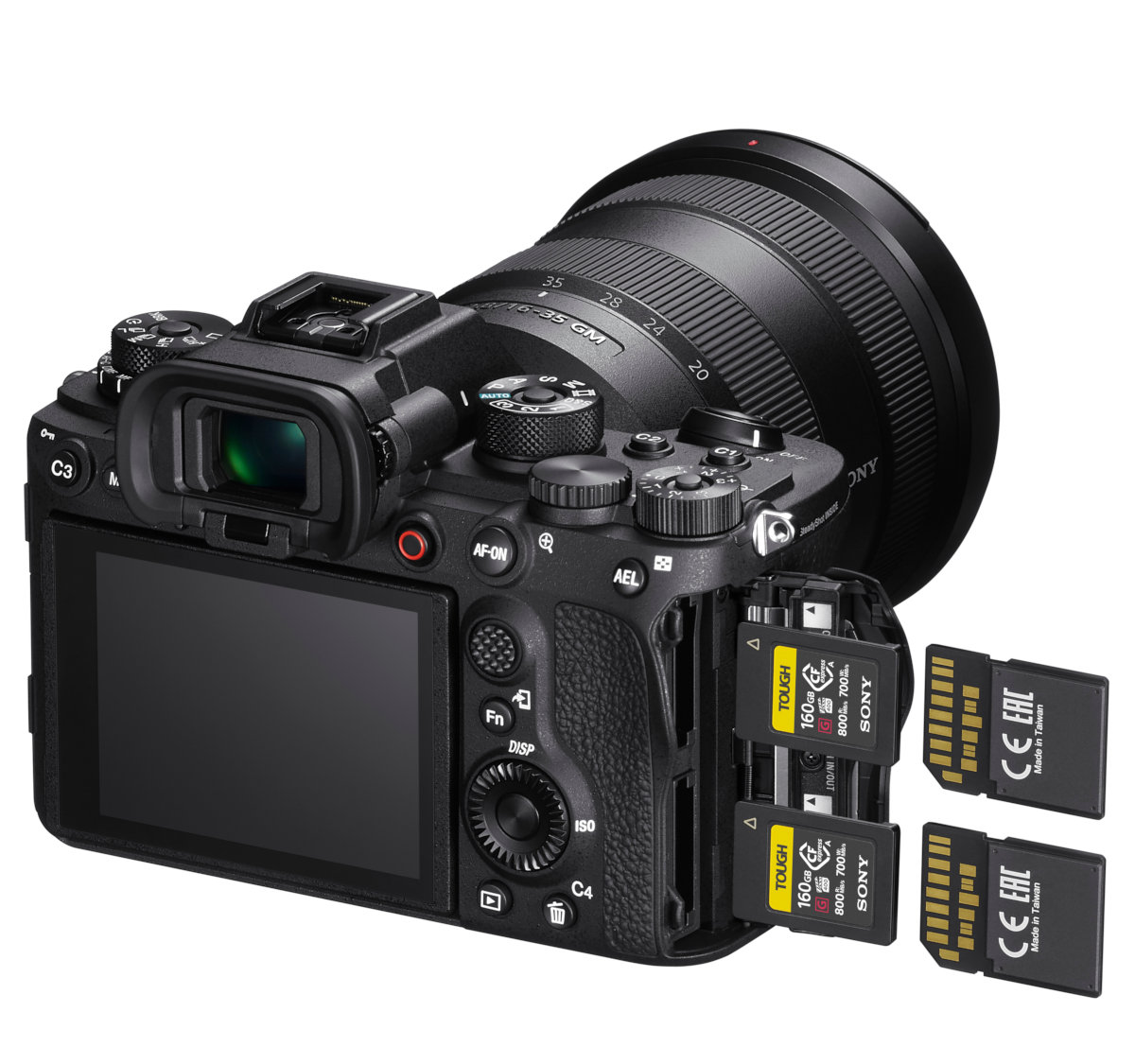 In der Alpha 1 können Sie entweder SD-Karten oder die wesentlich schnelleren CFexpress-Karten nutzen, beide Kartenschächte unterstützen beide Formate. (Bildquelle: Sony.de)