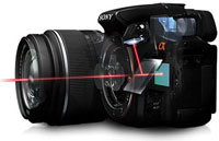 Interessant ist die Ausstattung mit einer Korrekturfunktion für Objektivfehler, die schnell und sauber ausgebügelt werden. Durch die SLT-Technik kann man das Motiv in Echtzeit direkt am LCD-Display beurteilen. Kommt man dem optischen Sucher mit dem Auge nahe genug, aktiviert sich dieser vollautomatisch und stellt in OLED-Technik das Motiv mit 2,4 Millionen Bildpunkten dar. Wer OLED-Anzeigen noch nie in der Realität begutachten konnte, sollte dies unbedingt einmal tun. Die Helligkeit und er Kontrast sind beeindruckend und Sony spricht von einem Faktor 10 gegenüber der herkömmlichen LCD-Technik einer Alpha 55. Gezeigt wird ein 100-Prozent-Bildfeld, das elektronische Unterstützung durch einen künstlichen Horizont (Wasserwaage) bekommt, sowie Vorschaumodi für veränderten Weißabgleich und Farbeffekte.