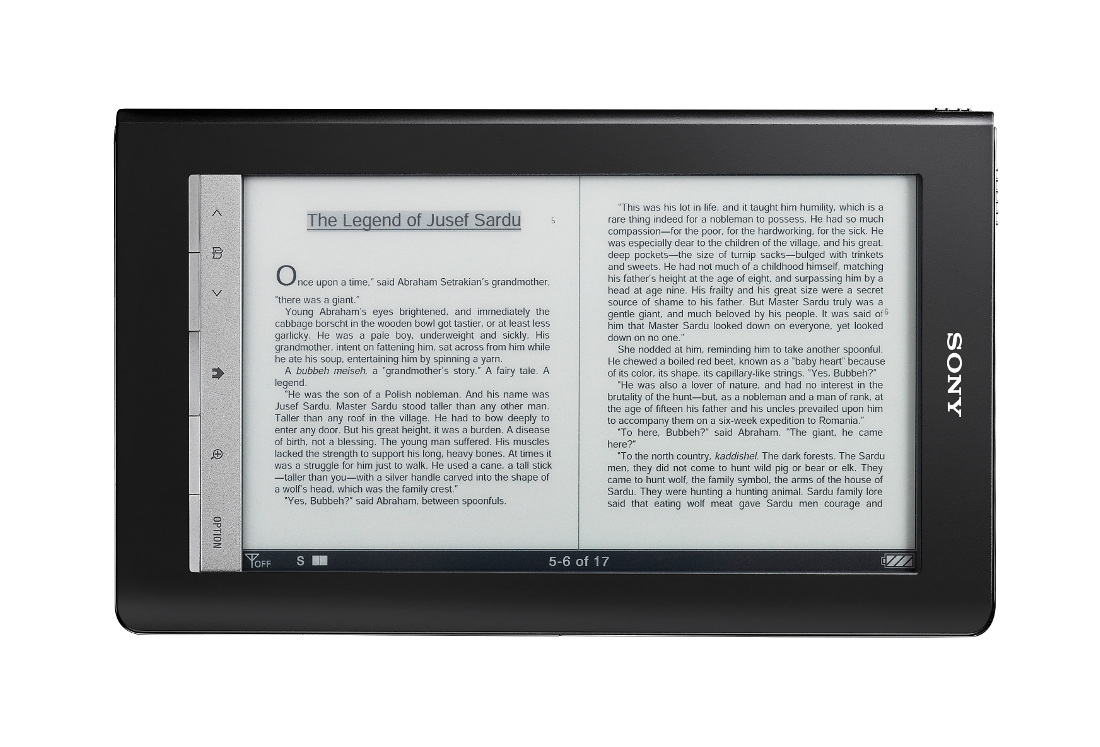 Auch unabhängig von seinem 3G-Internet-Zugang geizt das Flaggschiff der E-Book-Reader-Serie von Sony nicht mit Reizen. Das Display des Reader Daily Edition ist sieben Zoll groß und wie beim PRS 600 ein Touchscreen, überragt diesen aber in der Größe um einen Zoll. Die Pocket-Version muss sich gar mit 5 Zoll begnügen und auf einen Touchscreen verzichten. Auf den sieben Zoll des Daily Edition dürften Tageszeitungen oder Magazine so richtig zur Geltung kommen. Zur Auswahl steht übrigens ein Porträt- ( also Hochkant-) und ein Landscape (also Breitbild-)Modus. In der Hochkant-Ausrichtung zeigt das Display zwischen 30 und 35 Textzeilen an, was in etwa einer normalen Seite eines Taschenbuchs entspricht.