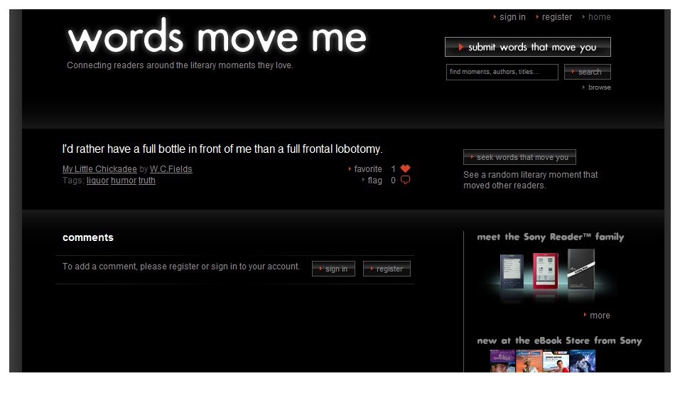 Der Launch des Reader Daily Edition wird schließlich noch von einer von Sony betriebenen Community-Seite namens Words move me (wordsmoveme.com) flankiert, auf der (Sony-Reader-)Leser ihre Leseerfahrungen kommunizieren und austauschen können. Das Portal ist Teil einer breit angelegten Reihe von Community-Seiten, über die Sony Social Networking betreiben und mit den Verbrauchern ins Gespräch kommen will.