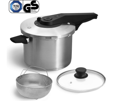 Der zeitsparende Edelstahl-Schnellkochtopf mit Füllstandanzeige überzeugt durch einen energieeffizienten Kapselboden mit Aluminium-Kern, welcher die Wärme effektiv an die Zutaten weiterleitet. Er eignet sich für alle Herdarten inklusive Induktion und dank seinen großzügigen sechs Litern Fassungsvermögen versorgt er problemlos einen Mehrpersonenhaushalt. Neben dem Druckdeckel haben Sie auch einen praktischen Glasdeckel zur Verfügung, um ihn als regulären Kochtopf nutzen zu können. Zudem gehört ein Dampfgareinsatz zur Ausstattung, mit welchem Sie beispielsweise Gemüse, Kartoffeln oder Fisch schonend und sanft über Wasserdampf garen können. Die beiliegende Gartabelle hilft Ihnen bei den Zubereitungszeiten von über hundert Lebensmitteln. Die Anwendung wird von Nutzern als komfortabel und sicher beschrieben, lediglich das Schließen des Druckdeckels bedarf etwas Übung. Das Modell verfügt über fünf verschiedene, im Deckel integrierte Sicherheitsmechanismen, welche den Druck stets in einem kontrollierbaren Maß halten. Druckregler und Druckanzeige bieten Übersicht über den aktuellen Stand. Der nach oben gerichtete Dampfauslass gewährt angenehmes Abdampfen, bei Bedarf direkt in Ihre Dunstabzugshaube. Die Reinigung des Topfes (ohne Druckdeckel) kann bequem in der Spülmaschine erfolgen.