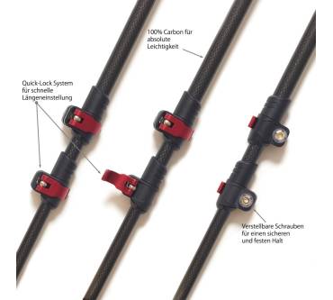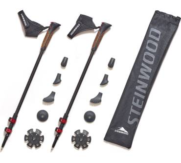 Nicht immer ist das Nordic Walking direkt vor der Haustür möglich und so ist es mehr als praktisch, dass die Stöcke von Steinwood auf eine Länge von 65 Zentimeter zusammengeschoben werden können und sich das Gesamtgewicht dank des verwendeten Carbons mit nur 400 Gramm gering hält. Ausgezogen werden maximal 135 Zentimeter erreicht. Damit eignen sich die Stöcke auch für größere Sportler gut. Für das unkomplizierte Einstellen der Länge und die Fixierung der einzelnen Segmente sind die Stöcke mit einem Quick-Lock-System aus leichtem Aluminium versehen. Eine Zentimeterskala erlaubt das präzise Einstellen auf die gewünschte Länge. Für die Nutzung auf den unterschiedlichsten Böden werden verschiedene Gummipuffer sowie je zwei Trekking- und Schneeteller mitgeliefert.