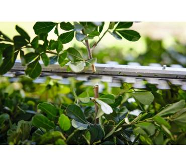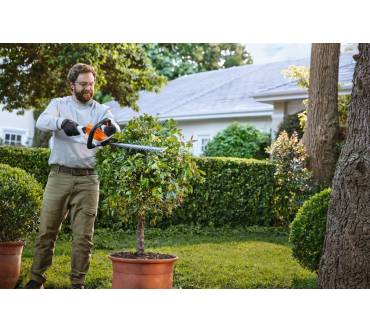 Mit dieser leichten Heckenschere von Stihl führen Sie relativ bequem Rückschnitte an kleineren Hecken und Büschen durch. Die Zweihandschaltung sorgt für Sicherheit und ist für Rechts- und Linkshänder gleichermaßen geeignet. Ein Anschlagschutz an der Messerspitze verhindert Schäden beim Kontakt mit Mauer oder Steinen. Die Akkulaufzeit ist mit bis zu 40 Minuten ordentlich, wobei Sie die Stihl derzeit auch im Set mit 2 Akkus und Ladegerät erwerben können. Dabei sparen Sie immerhin 66 Euro gegenüber dem Einzelerwerb und können die Akkus für weitere Geräte des Herstellers einsetzen. Den Ladestand lesen Sie auf Knopfdruck in Stufen seitlich ab. Die HS 40 punktet außerdem mit ihrem Fliegengewicht von 2,1 kg, mit dem Sie auch längere Sessions ermüdungsfrei absolvieren.