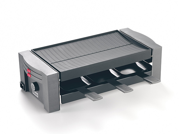 Das Raclettegerät von Stöckli gehört zu den seltenen Exemplaren, bei denen die Pfännchen nicht nur, wie gewöhnlich, mit Oberhitze in Form einer simplen Heizschlange überbacken werden. Stattdessen können diese bei Bedarf auch von unten erwärmt werden. Diese technische Besonderheit garantiert zum einen, dass die Zutaten auf den Pfännchen besser durchgebraten werden. Das Stöckli kommt daher allen Raclettefans entgegen, die es besonders lieben, die Pfännchen mit wahren Türmen von Zutaten zu belegen, wobei das Gerät der Experimentierfreude kaum Grenzen setzt – die Pfännchen fallen nämlich mit 10 x 10 Zentimetern Grundfläche sowie einer Höhe von 1,5 Zentimetern außergewöhnlich großzügig aus. Der Unterhitze verdankt es das Raclette aber auch, dass in den Pfännchen gleichzeitig Mini-Pizzas ausgebacken werden können. Da sich die Oberhitze stufenlos regulieren lässt, kann der Ausbackprozess relativ gut kontrolliert werden. Drittens schließlich verfügt das Raclettegerät auch noch über eine große Grillfläche. Die Leistungsaufnahme von 1.300 Watt garantiert dabei, dass diese ausreichend heiß wird und sich damit für nahezu jedes Grillgut – fette T-Bone-Steaks einmal ausgenommen – eignet.