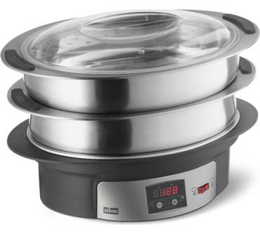 Aus der Schweiz kommt mit dem Steamer Program der Traditionsfirma Stöckli ein Dampfgarer, der sich schon optisch von vielen anderen Etagen-Standgeräten unterscheidet. Während bei den meisten davon die Garbehälter aus Kunststoff sind, präsentiert sich der Steamer mit zwei massiven Edelstahl-Sieb-Aufsätzen, die zudem mit je vier Litern Fassungsvermögen vergleichsweise groß sind.