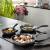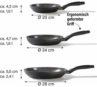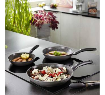 Das dreiteilige Pfannenset mit kratzfester STONELINE® CERAMIC Beschichtung eignet sich für alle Herdarten inklusive Induktion und ist ideal für sämtliche Brat- und Schmorgerichte. Es beinhaltet verschiedene Durchmesser für vielfältige Einsatzmöglichkeiten (20, 24 und 28 Zentimeter). Nutzer verwenden diese beispielsweise für Fleisch, Fisch, Gemüse, Eierspeisen und Bratkartoffeln. Darüber hinaus sind die Pfannen bis 180 Grad Celsius backofengeeignet und auch das Flambieren ist möglich. Der extrastarke 2,8 Millimeter Pfannenboden ist solide und verzugsfrei, die Wärmeverteilung erfolgt gleichmäßig. Die Keramik-Beschichtung punktet mit einem mit Lotus Abperl-Effekt, das Gargut haftet nicht an, wie Anwender bestätigen. Lediglich die Lebensdauer der Antihaft-Wirkung könnte laut einiger Rezensenten noch länger sein. Die Reinigung ist aufgrund des Lotus-Effekts leicht zu bewältigen.