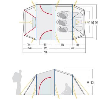 Wenn Familien einen Campingurlaub machen, ist meistens viel Gepäck dabei. Damit dennoch genug Platz zum Ausbreiten im Innenzelt bleibt, benötigt man ein geräumiges Vorzelt mit viel Stauraum. Das vorliegende Tunnelzelt kann mit einer solchen Apsis dienen. Das Vorzelt misst 240 mal 260 Zentimeter und ist unterteilt in einen Ein- und Durchgangsbereich sowie einen abgetrennten Stauraum für Taschen und Ausrüstung. Bei regnerischem Wetter kann das Vorzelt auch als Kochstelle verwendet werden – für ein oder zwei Campingstühle ist hier ebenfalls Platz. Der Schlafbereich im Innenzelt sollte mit einer Fläche von 230 mal 240 Zentimetern ausreichend für eine Familie mit ein bis zwei Kindern oder eine drei- bis vierköpfige Gruppe sein. Das Zelt verfügt über drei Eingänge und zwei von innen verschließbare Lüftungsöffnungen – so kann das Zelt stets gut durchlüftet werden, damit es nicht zu stickig wird. Bei einer Wassersäule von 8.000 Millimetern im Außenzelt und 10.000 Millimetern im Bodenmaterial sollte man im Inneren auch bei längeren Regenfällen trocken bleiben. Für Sicherheit bei Dunkelheit sorgen die Reflektoren an den Abspannleinen – so sollten Stolper-Missgeschicke der Vergangenheit angehören.