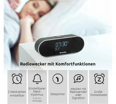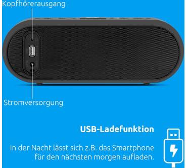 Die integrierte Uhr kann unterschiedliche Weck-Zyklen verarbeiten (einmal, täglich, werktags, Wochenende) und verfügt ferner über eine Snooze- und Sleep-Funktion. Um Ihr Smartphone über Nacht oder zwischendurch aufzuladen, können Sie auf den USB-Port zurückgreifen.