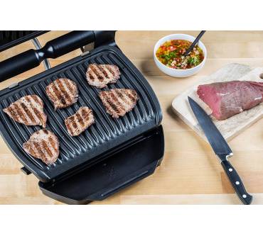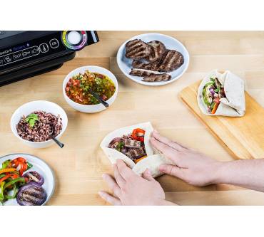 So oder so ähnlich könnte das Motto des OptiGrill Smart GC730D von Tefal lauten. Via Bluetooth und mit der entsprechenden App können Grillmeisterin oder Grillmeister mit ihrem Arbeitsgerät Verbindung aufnehmen. Dabei lassen sich bis zu zwölf Nutzerprofile für die individuellen Vorlieben der Gäste abspeichern. Mit einer Grillfläche von gerade einmal 600 Quadratzentimeter eignet sich der Grill allerdings eher für den gemütlichen Abend zu zweit und kleine Grillrunden. Sechs Programme sind vorwählbar, ein Lichtindikator gibt Auskunft in welcher Phase des Garprozesses sich das Grillgut gerade befindet. Und was sagen die Nutzer? Ein Teil der Grillfreunde auf Amazon ist mit der Unzuverlässigkeit der Steuerelektronik und der Defektanfälligkeit bereits nach kurzem Gebrauch gar nicht zufrieden. Acht von zehn Anwendern sind allerdings angetan, teils sogar hellauf begeistert. Gelobt wird in erster Linie das Grillergebnis.