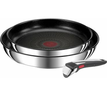 Tefal legt dem L97490 Ingenio Preference On Pfannenset einen Griff bei, den Sie für beide Pfannen verwenden. Dank des abnehmbaren Griffs lässt sich Kochgeschirr platzsparend aufbewahren und auch in kompakten Backöfen nutzen. Die Antihaftbeschichtung verfügt über eine Verstärkung aus Titan. Das macht sie sehr robust, kratzfest und temperaturbeständig. Die Pfannen selbst bestehen aus Edelstahl. Das Material punktet durch eine gleichmäßige und lang anhaltende Wärmeverteilung für effizientes Kochen. Unterstützt wird dies durch einen verstärkten Boden, Thermo-Fusion genannt. Integriert ist auch der Wärmespot, den Tefal in zahlreiche Pfannen integriert. Der Punkt am Pfannenboden leuchtet auf, sobald die gewünschte Temperatur erreicht ist. Für rund 110 Euro erhalten Sie hier eine durchweg gute Leistung.