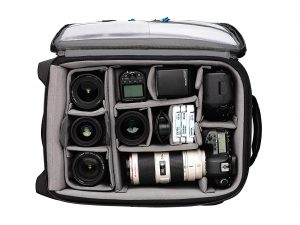 Einen geräumigen Foto-Trolley erhalten Sie mit dem Roadie Hybrid Roller 21 von Tenba. Er bietet beispielsweise Platz für eine große Spiegelreflexkamera, vier Objektive und weiteres Equipment (ein Beispiel sehen Sie auch im Bild).