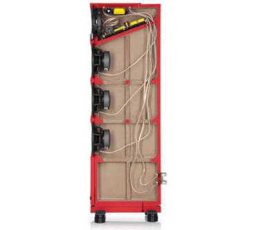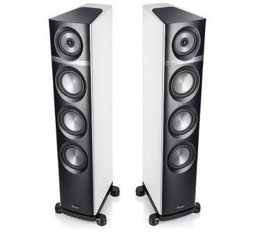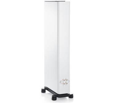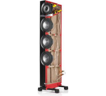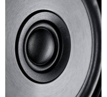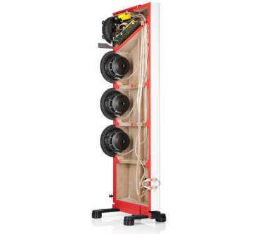 Besonderes Augenmerk lag auf dem Mittelhochtöner: Mit einer patentierten Technologie namens „Synchronized Coaxial Accoustics“ (SCA) will sich das Unternehmen aus Berlin dem Ideal einer punktförmigen Schallquelle nähern. Punktschallquallen liefern besonders räumliche Ergebnisse, denn in Sachen Ortbarkeit suchen sie ihresgleichen. Überdies wirbt Teufel mit hoher Feindynamik. Dabei sitzt der 25 Millimeter-Hochtöner, der mit einer beschichteten Gewebekalotte aufwartet, nicht nur im Zentrum des 105 Millimeter-Flachmembran-Mitteltöners, sondern spielt auch auf derselben Ebene. Die Flachmembran des Mitteltöners besteht aus zwei Schichten, wobei die vordere aus Aluminium und die hintere aus Kevlar gefertigt wurde, was Partialschwingungen und mithin Interferenzen eliminieren soll. Taumelbewegungen der Membran begegnet Teufel mit zwei invertiert zueinander ausgelegten Sicken. Das Chassis verdingt sich in einer geschlossenen Kammer, die abgewinkelt wurde, um stehende Wellen zu minimieren und das untere Gehäusevolumen zu vergrößern. Die Frequenzweichen sitzen ebenfalls in der oberen Kammer, denn hier entsteht weniger Druck als im Rest des Gehäuses.Frequenzen ab 42 Hertz