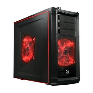 Das mittelgroße PC-Gehäuse wird in mattem Schwarz gelifert und zeigt ein feines Mesh-Gewebe als Frontpanel. Dahinter liegt ein Multicolor-beleuchteter 200 Millimeter großer Lüfter mit Drehzahlen von 600 bis 800 und einer maximalen Lautstärke von 14 dB(A). Im linken seitenteil wurde der mit 230 Millimetern größte Lüfter installiert, der von einem 200er im Topbereich unterstützt wird. Lediglich der rückwärtige kleinere (140 Millimeter) ist mit 16 dB(A) etwas lauter, was aber nicht als störend empfunden werden kann. Der Bauhöhe von 48 Zentimetern entsprechend stehen nur drei 5,25 Zoll-Einschübe zur Verfügung. Intern sind es dann sieben 3,5 Zoll-Einschübe, die um 90 Grad gedreht sind und eine schnelle Montage der Festplatten erlaubt, sowie der Einbau größerer Grafikkarten erlaubt. Zwei weitere Positionen machen Platz für die kleinen Festplatten, die inzwischen gerne als SSD ihren Platz im Computer finden. Thermaltake liefert auch die passenden Adapter dazu. Das Netzteil findet im Bodenteil eine stabile Verankerung. Um eine saubere Kabelführung zu gewährleisten, hat der Hersteller ausreichend Öffnungen vorgesehen, um auch Schläuche einer Wasserkühlung unterbringen zu können. Insgesamt sieben rückwärtige Slots erlauben den Einbau eines vollwertigen ATX-Mainboards, aber auch Haltebohrungen für Micro-ATX sind bereits vorhanden.