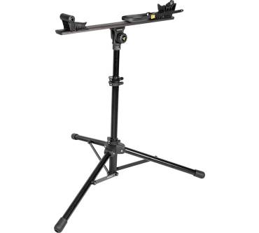 Anders als die meisten anderen Montageständer arbeitet der Prepstand X von Topeak mit einer Schiene. Sie platzieren Ihr Rad kopfüber mittels Steuerrohr und Sattelstütze, statt es an diesen Stellen zu klemmen - das schont teures Material. Sie müssen dafür allerdings immer das Vorderrad abmontieren. Dafür lässt sich der Ständer nicht nur in der Höhe verstellen: Sie können das aufgebockte Rad auch um 360 Grad drehen, horizontal und im 90 Grad Winkel einstellen. Für manche Mountainbikes ist die limitierte Schienenlänge zu kurz - der Ständer eignet sich vorrangig für hochwertige Roadbikes. Trotz der stabilen Machart ist der Ständer leicht und kann gut transportiert werden. Er gehört zu den höherpreisigen Modellen auf dem Markt.