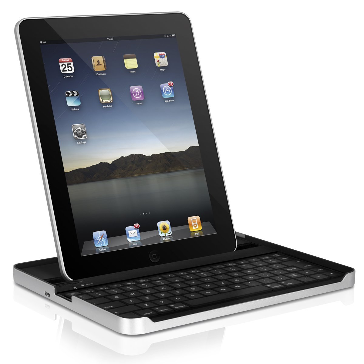 In die Schutzhülle ist gleichzeitig eine Tastatur integriert, die sich via Bluetooth mit dem iPad verbindet. Anschließend lassen sich auf ihr nicht nur zum Beispiel längere Texte viel komfortabler tippen als auf der virtuellen Tastatur des Tablet-PCs. Das Keyboard verfügt ferner auch über zusätzliche Funktionstasten zur Lautstärkeregelung, für Diashows, die Startseite des iPad oder dessen Suchfunktion. Selbstverständlich kann das iPad außerdem entweder im Querformat oder im Hochformat aufgestellt werden. Um die Stromversorgung schließlich kümmert sich ein Lithium-Ionen-Akku, der via miniUSB aufgeladen wird.