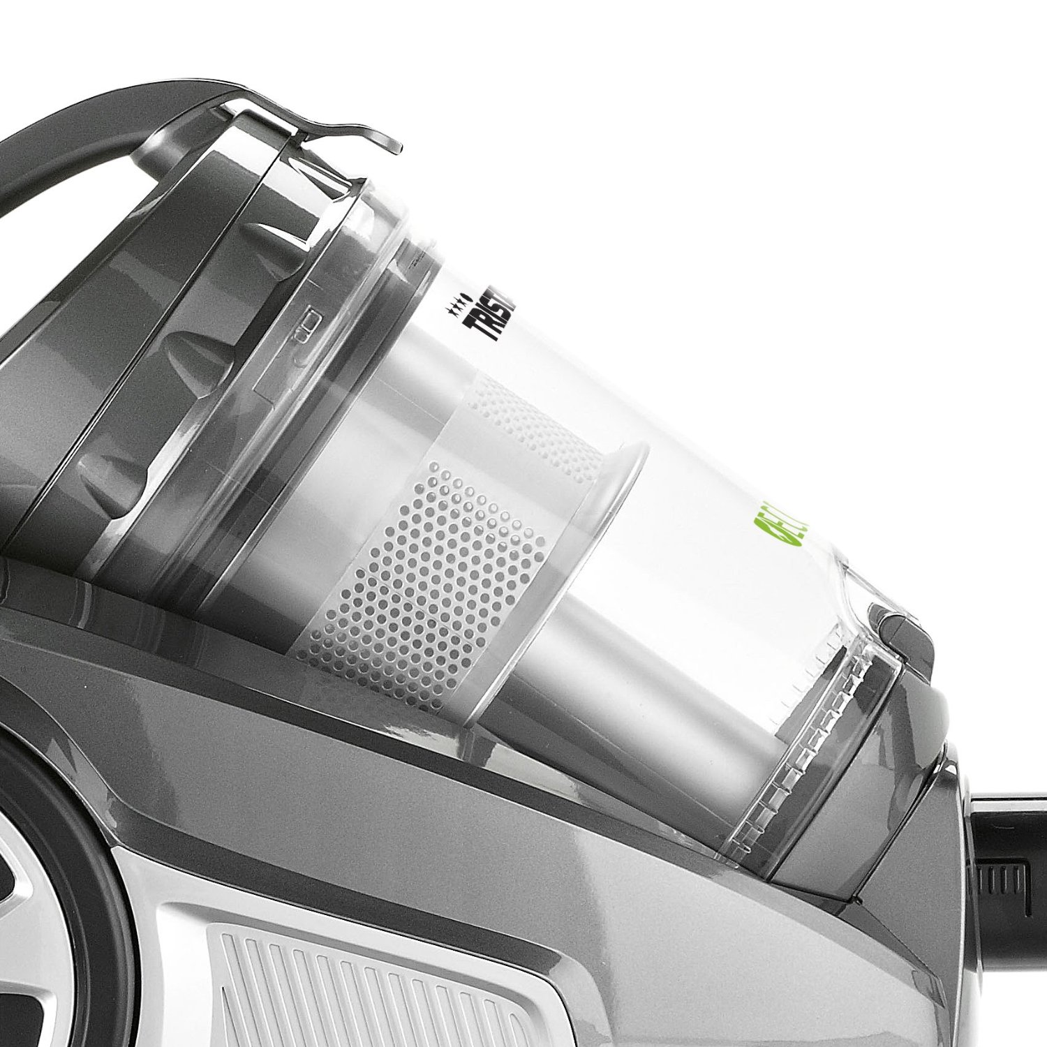 Die Wohnung ist großflächig mit Teppichen ausgelegt? Auf denen sich vielleicht sogar Hund oder Katze austoben und dabei massenweise Haare hinterlassen? Gut, in diesem Fall sollte Abstand vom Tristar genommen werden. Für diese Aufgaben fehlt ihm schlichtweg das passende Equipment. Seine Kombidüse, das heißt, die bekannte Standarddüse zum Umschalten von Hart- auf Teppichböden, fühlt sich auf glatten Böden um einiges wohler. Staub/Dreck, ja sogar Feinstaub zieht sie ohne Schwierigkeiten ein. Lediglich bei etwas schwereren Partikeln, wie zum Beispiel Sand, muss ab und zu ein bisschen nachgeholfen werden. Praktisch: Die Saugluft wird mit Hilfe mehrerer Luftwirbel („Multizyklone“) von Staub befreit. Der bei Modellen mit nur einem Zyklon („Singlezyklon“) für den Feinstaub zwingend notwendige Zusatzfilter entfällt – und damit auch dessen aufwändige Reinigung nach jedem Arbeitsgang. Beim Tristar muss lediglich der Staubbehälter regelmäßig geleert werden. Das kommt nicht allzu häufig vor. Der Behälter fasst nämlich rund drei Liter, ungewöhnlich viel für einen beutellosen Staubsauger.