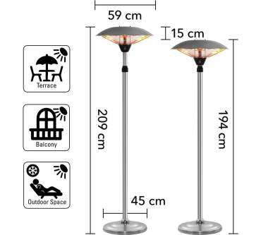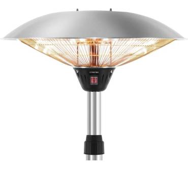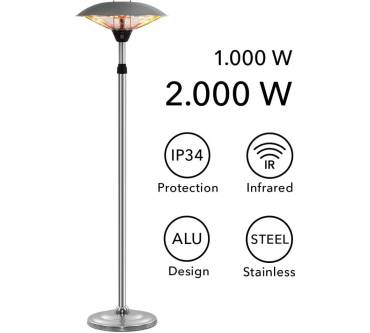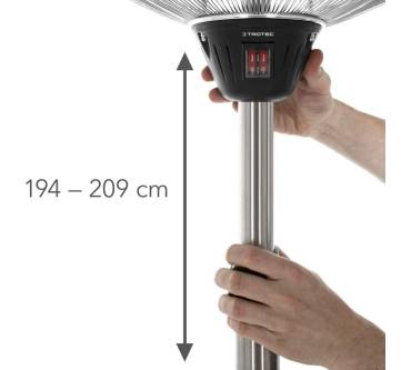Der Heizstrahler von Trotec ist für die Verwendung in überdachten Außenbereichen vorgesehen. Die Wärme wird mithilfe eines Infrarot-Heizelements erzeugt. Die Geräteleistung wählen Sie in zwei Stufen zwischen einem und 2 Kilowatt. Der Heizstrahler ist aus Aluminium und Edelstahl gefertigt und damit gegen Korrosion durch Witterungseinflüsse geschützt. Der Strahler ist im Bereich zwischen 1,94 und 2,09 Meter höhenverstellbar. Für Sicherheit während des Betriebes sorgt ein Kippschutz. Dafür, dass es zu keinen Verbrennungen während eines gemütlichen Abends auf der Terrasse kommen kann, sorgt ein Schutzgitter. Die Länge der elektrischen Zuleitung gibt der Hersteller mit 1,75 Meter an.