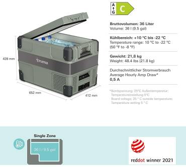 Die Truma C36 Single Zone ist zwar nicht günstig, steht aber hoch in der Gunst von Kunden und Testern. Bereits die Verarbeitung soll sich sehen lassen können. Die Kühlleistung liegt natürlich unter der eines herkömmlichen Kühlschranks, dennoch kühlt die Box laut Kunden schnell herunter und hält die Temperatur dann gut. Die Kontrolle der Temperatur und deren Einstellung sind über eine App möglich, sobald die Box mit einem Smartphone über Bluetooth verbunden wurde. Der Deckel kann zum einfacheren Befüllen aufgestellt werden. Die Reinigung ist laut Kunden einfach. Schmelz- und Kondenswasser können durch eine Öffnung an der Unterseite ablaufen. Mit rund 22 Kilogramm ist die C36 etwas schwerer als andere Boxen mit 35 Litern Nutzvolumen. Der Stromverbrauch und die Betriebslautstärke (42 Dezibel) sind jedoch vergleichsweise gering. Die Box kühlt und gefriert in einem Temperaturbereich von -22 bis +10 Grad.