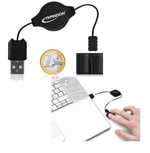 Eine Menge Fingerspitzengefühl ist notwendig, will man am Notebook die MO-100 zur zielsicheren Bewegung des Mauszeigers einsetzen. Das vom Hersteller Typhoon auch als „Nano Maus“ bezeichnete Eingabegerät ist nämlich so klein, dass auf den beiden Tasten sogar die Finger kaum genügend Platz für sich finden.
