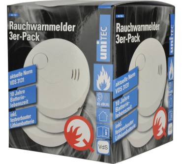 Der Rauchmelder von Unitec ist für die Montage an der Decke vorgesehen und kommt mit dem benötigten Montagezubehör. Sie können das Gerät in Räumlichkeiten mit einer Grundfläche von bis zu 50 Quadratmetern einsetzen. Gespeist wird der potentielle Lebensretter von einer hochwertigen Lithiumionen-Batterie, die fest verbaut ist und einen zehnjährigen Dauerbetrieb ermöglichen soll. Der Hersteller ist von der Qualität seines Produktes überzeugt und gewährt dementsprechend fünf Jahre Garantie. Die mit etwa drei Zentimeter ausreichend große Bedientaste ist gut erreichbar angebracht, sodass Sie die obligatorischen Funktionstests ohne große Mühe durchführen können. Das „ETM Testmagazin“ (12/2019) ist von der Funktionalität des Geräts aufgrund der vergleichsweise langen Reaktionszeit nicht ganz überzeugt. Deutlich besser wird die unkomplizierte Bedienung des Melders bewertet.