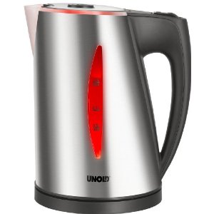 Zuerst einmal müssen jedoch all jene gewarnt werden, die sich einen reinrassigen Edelstahlkocher wünschen. Beim Unold besteht nämlich lediglich die Außenwand aus dem edlen Material, innen ist er mit gewöhnlichem Plastik ausgekleidet. Dies hat Vor- und Nachteile. Zum einen ist der Wasserkocher an der Außenseite durch die doppelwandige Bauweise tatsächlich relativ „kühl“, da das Plastik besser isoliert als das Metall. Andererseits riecht der Wasserkocher anfänglich leicht nach Kunststoff und sollte daher ein paar Mal „ausgekocht“ werden – der Geruch verfliegt allerdings relativ schnell. In puncto Heizleistung wiederum scheint der Unold ohne Fehl und Tadel zu sein. Für die maximale Füllmenge von 1 Liter benötigt er laut Käuferbewertungen lediglich rund drei Minuten und verdient sich daher die Bezeichnung „Blitzkocher“ zurecht. Praktisch ist auch die beleuchtete Wasserstandsanzeige sowie das verdeckte Heizlelement, der kabellose Betrieb wiederum darf mittlerweile als Standard für einen Wasserkocher gelten.