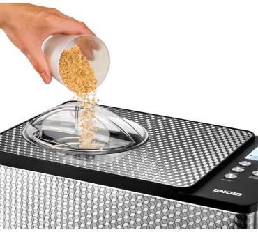 Die robuste Eismaschine in edlem Design zählt zu einer auf 1.000 Stück limitierten Auflage. Sie überzeugt nicht nur mit glänzender Optik, sondern auch durch Leistung und Ausdauer für Ihre persönlichen Eiscreme-Kreationen. Der solide Motor eignet sich für den Dauerbetrieb, zudem erhalten Sie vom Hersteller eine fünfjährige Garantieurkunde. Mit 1,5 Litern Volumen versorgt sie problemlos die Besucher Ihrer nächsten Gartenparty. Dank vollautomatischem, selbstkühlendem Kompressor für kontinuierliche Kälteerzeugung entfallen lange Wartezeiten, Sahneeiscreme mit vorgekühlten Zutaten ist beispielsweise in nur 30 Minuten fertig, wie Nutzer bestätigen. Die Bedienung erfolgt einfach über ein großes LC-Display, Temperatur und Laufzeit können Sie individuell einstellen. Dank Deckelöffnung ist die Ergänzung von weiteren Zutaten wie Nüssen jederzeit möglich. Der eloxierte Eisbehälter ist entnehmbar und leicht zu reinigen.