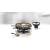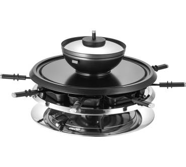 Es handelt sich hier um Raclette, Fondue, Grill und heißer Stein vereint in einem 1.300 Watt starken Gerät. Sie können im Vergleich zu Konkurrenzmodellen die Funktionen auch separat voneinander verwenden, was Nutzer schätzen. Raclette und Fondue sind auf bis zu acht Personen ausgerichtet, dank Kreisform ideal für große Tischrunden. Der antihaftbeschichtete Fonduetopf fasst 500-700 Milliliter Inhalt und eignet sich gut für Fleisch- und Gemüsestückchen. Deckel, Spritzschutz und Gabelhalter erleichtern Ihnen die Handhabung ebenso wie die längenverstellbaren Fonduegabeln. Die antihaftbeschichtete Grillplatte und den Naturstein können Sie abnehmen, sie sind jeweils mit einer Fettauffangrille ausgestattet, damit nichts heruntertropft. Die antihaftbeschichteten Pfännchen fallen besonders tief aus, wodurch Ihnen der Käse nicht zu schnell anbrennt. Alle Teile sind zerlegbar und gut zu reinigen.