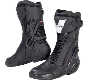 Der RV6 von Vanucci wird in drei Modellvarianten angeboten, und zwar einfach als RV6, als RV6 Performance und als RV6 Pro. Alle Modelle sollen sich durch eine angenehme Passform und hohen Tragekomfort auszeichnen. Im Unterschied zu den beiden anderen Modellen ist der RV6 Pro insbesondere für die Rennstrecke gedacht und dafür mit einem zusätzlichen Gelenksystem ausgestattet. Dieses soll den Schaft flexibel machen, aber das Verdrehen des Fußes verhindern. Zur bequemen Passform trägt unter anderem der elastisch vernähte Reißverschluss bei, der wie ein Stretcheinsatz wirkt. Außerdem erleichtert eine Innenschnürung das Anpassen des Schaftes an Fuß und Wade. Testern gefällt die gute Belüftung über einen Einsatz an der Vorderseite. Kritik wird jedoch an der Position des Knöchelschutzes geübt.