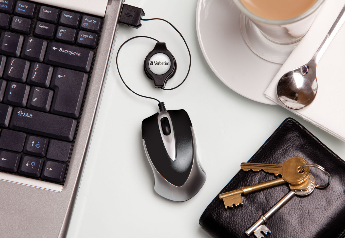 Genau diesen Komfort eines Aufrollmechanismus bietet jetzt wieder die neue Verbatim-Maus, die zudem recht handlich ausfällt, ohne deswegen von größeren Händen gleich auf Nimmerwiedersehen verschluckt zu werden. Die genaue Maße belaufen sich auf 15 mal 4,2 mal 2,9 Zentimeter. An Bord arbeitet ein optischer Sensor mit 1.000 dpi, der auf fast allen Untergründen, sofern sie nicht spiegeln oder zu rau sind, gute Arbeit verrichten dürfte. Das Design wiederum ist streng symmetrisch, damit sich auch Linkshänder mit der Maus wohlfühlen. Zur Auswahl stehen schließlich noch vier Farben, nämlich Schwarz und Blau sowie, eher etwas für mutige Zeitgenossen, Orange und Pink.