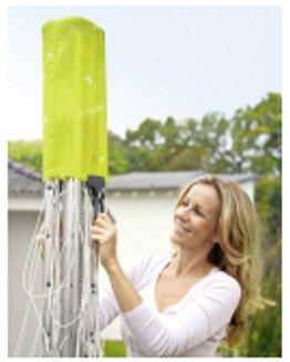 Integriert bedeutet, dass die Schutzhülle in der zentralen Stange untergebracht ist. Sie wird zugänglich, sobald die vier Arme der Wäschespinne zusammengeklappt werden. Dabei verschwinden die Leinen nicht, wie dies bei einigen Konkurrenzmodellen der Fall ist, in den Seitenarmen, sondern sind schutzlos dem Wetter ausgeliefert und verschmutzen dementsprechend leicht. Die Schutzhülle schafft nun sichere Abhilfe, sie muss einfach nur heraus- und über das angelegte Gestänge gezogen werden. An ihre Unterbringung dagegen muss ein Gedanke mehr verschwendet werden.
