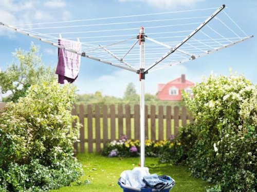 Die Wäschespinne ist nicht nur ein Leichtgewicht, sie bietet auch ordentlich viel Platz. Die Leinenlänge beläuft sich insgesamt auf knapp über 50 Meter. Effektiv behängt, können auf der Vileda bis zu vier, fünf Waschmaschinenladungen untergebracht werden. Vorsicht ist allerdings bei langen Wäschestücken, etwa bei Bettwäsche, angesagt. Aufgrund ihrer Maximalhöhe von 172 Zentimetern können diese nämlich mitunter nicht in kompletter Länge aufgehängt werden. Die Spinne selbst misst im aufgeklappten Zustand drei Meter im Durchmesser. Zusammengeklappt wiederum ist sie nur noch 12 mal 12 und 198 Zentimeter groß, inklusive Bodenhülse. Im Prinzip ist es daher sehr einfach, die Wäschespinne aufgrund ihrer kompakten Maße bei aufkommendem schlechten Wetter einfach ins Trockene zu retten, da sie zudem sehr leicht sein soll – das exakte Gewicht verschweigt das Datenblatt allerdings. Alternativ dazu können die Arme und die Leinen unter einer separaten Schutzhülle daran gehindert werden, zu verschmutzen oder auf Dauer spröde zu werden. Noch praktischer geht dies übrigens mit dem neuesten Modell der Viva-Air-Serie, der Version „Protect“. Sie verfügt nämlich über eine integrierte Schutzhülle, die bei Bedarf aus dem Gestänge herausgezogen werden kann und daher nicht separat verstaut werden muss. Aufgeklappt wird die Vileda übrigens mit einem Seilzugmechanismus, dessen Leichtgängigkeit von Kunden bei anderen Modellen des Herstellers schon mehrfach bestätigt wurde.Fazit